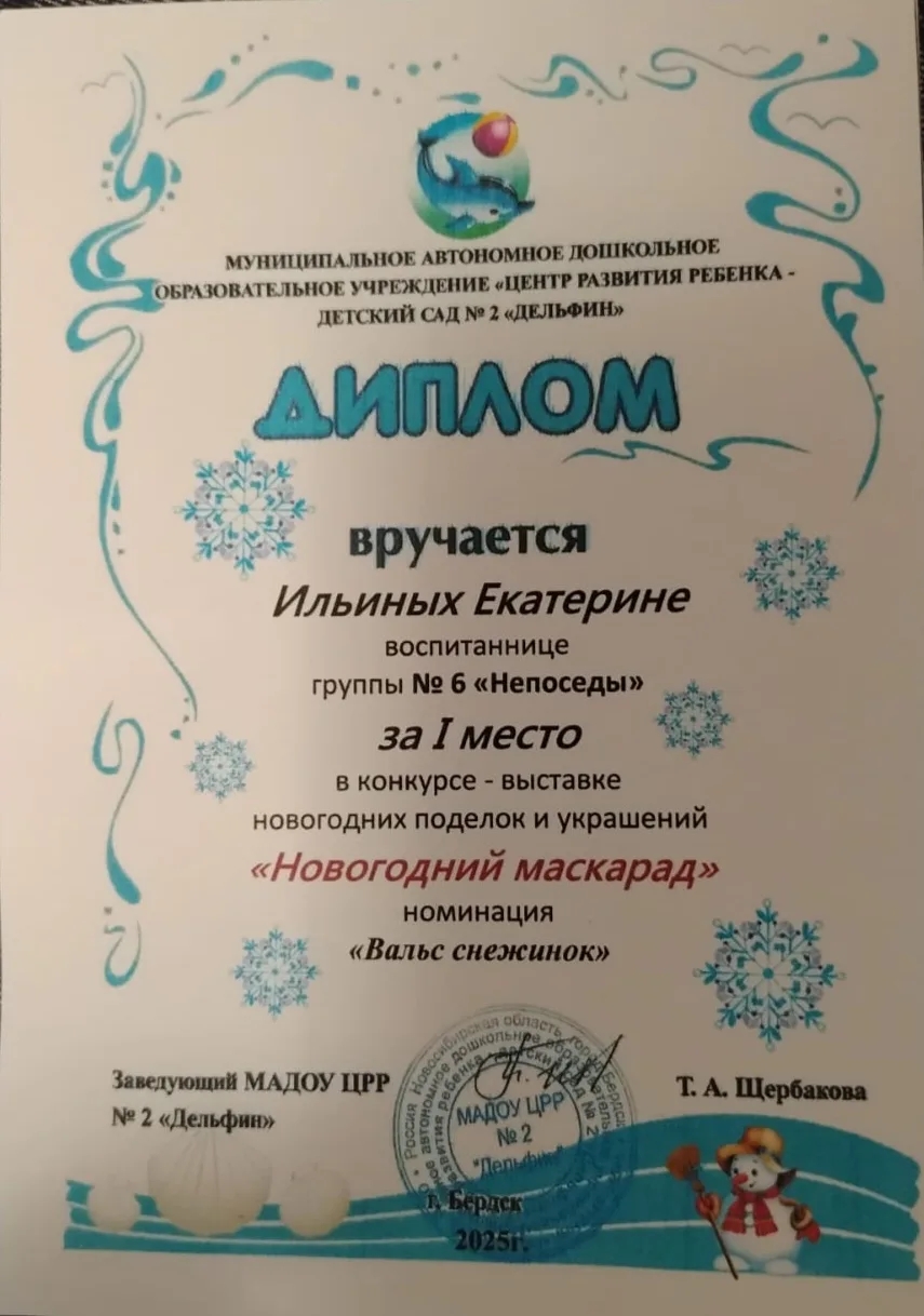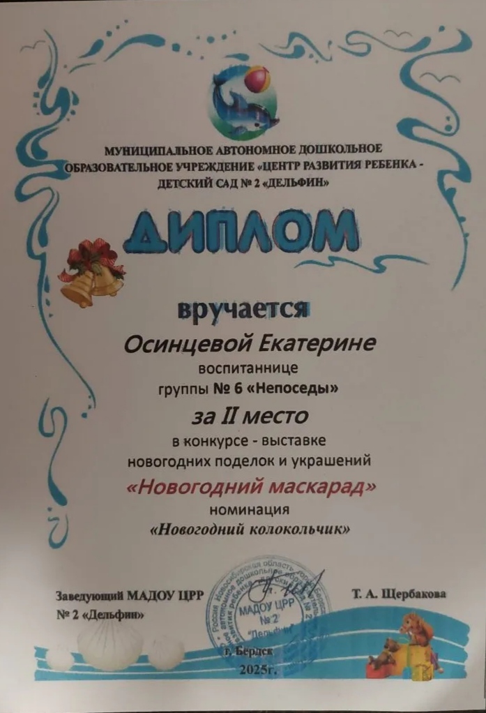 Диплом за II место вручается Ильиных Екатерине в конкурсе выставке новогодних поделок и украшений "Игрушки для уличной ёлки". 2024 год