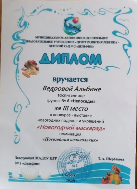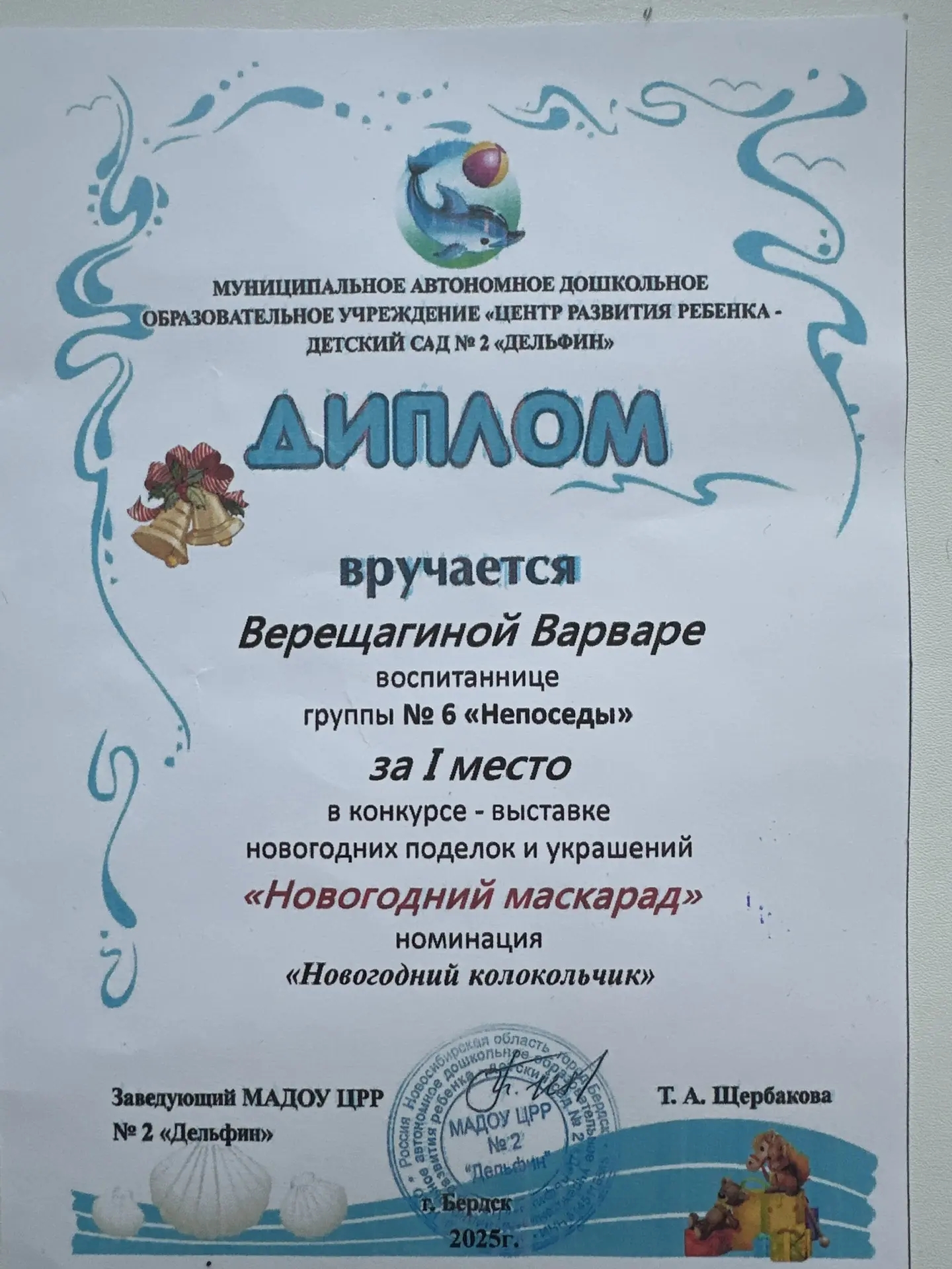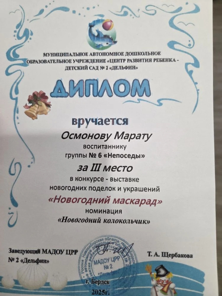 Диплом за I место вручается Легомину Кириллу в конкурсе выставке новогодних поделок и украшений "Игрушки для уличной ёлки". 2024 год