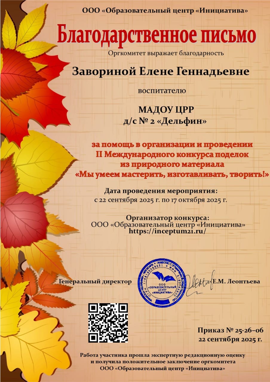 Благодарственное письмо за помощь в организации и проведении II Международного конкурса поделок из природного материала "Мы умеем мастерить, изготавливать, творить!"