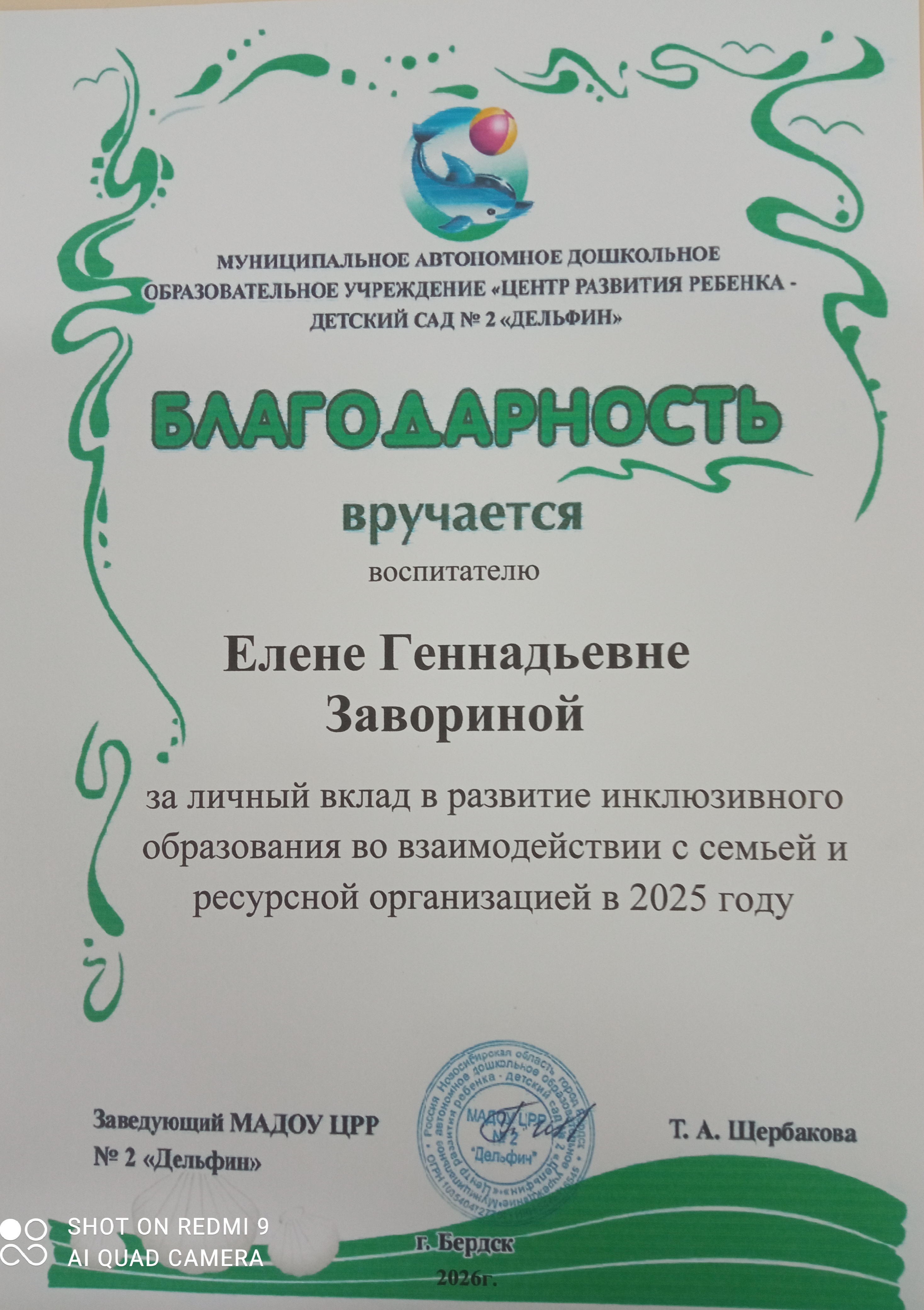 Благодарность за личный вклад в развитие в инклюзивного образования во взаимодействие с семьёй и ресурсной организацией в 2025 году. 2026 год